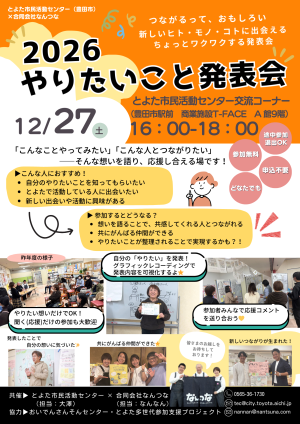 昨年度も開催し、たくさんのつながりができた「やりたいこと発表会」を今年も開催します。