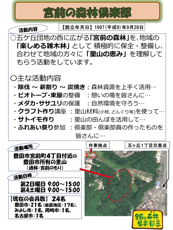 ○五ケ丘団地の西に広がる「宮前の森林」を、地域の「楽しめる雑木林」 として 積極的に保全・整備し、 合わせて地域の方々に「里山の恵み」を理解してもらう活動をしています。